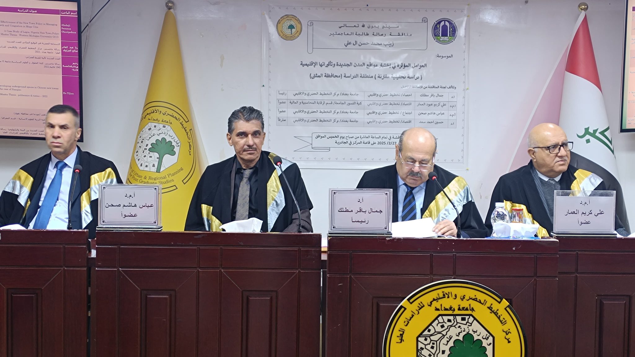 The Center of Urban and Regional Planning for Postgraduate Studies at the University of Baghdad discussed the master’s thesis entitled (Factors affecting the selection of the location of new cities and their regional impacts “Comparative Analytical Study” Study area: Al-Muthanna Governorate), by the student Zainab Muhammad Hassan, and supervised by Professor Dr. Hussein Ahmed Al-Shadidi.