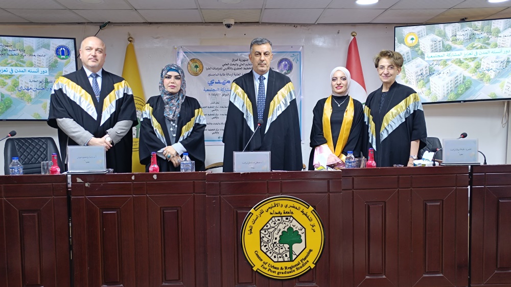 The Center of Urban and Regional Planning for Postgraduate Studies at the University of Baghdad discussed the master’s thesis titled “The Role of Humanizing Cities in Enhancing Community Participation” by student Nour Hassan Mahdi, supervised by Assistant Professor Dr. Ammar Khalil Ibrahim.
