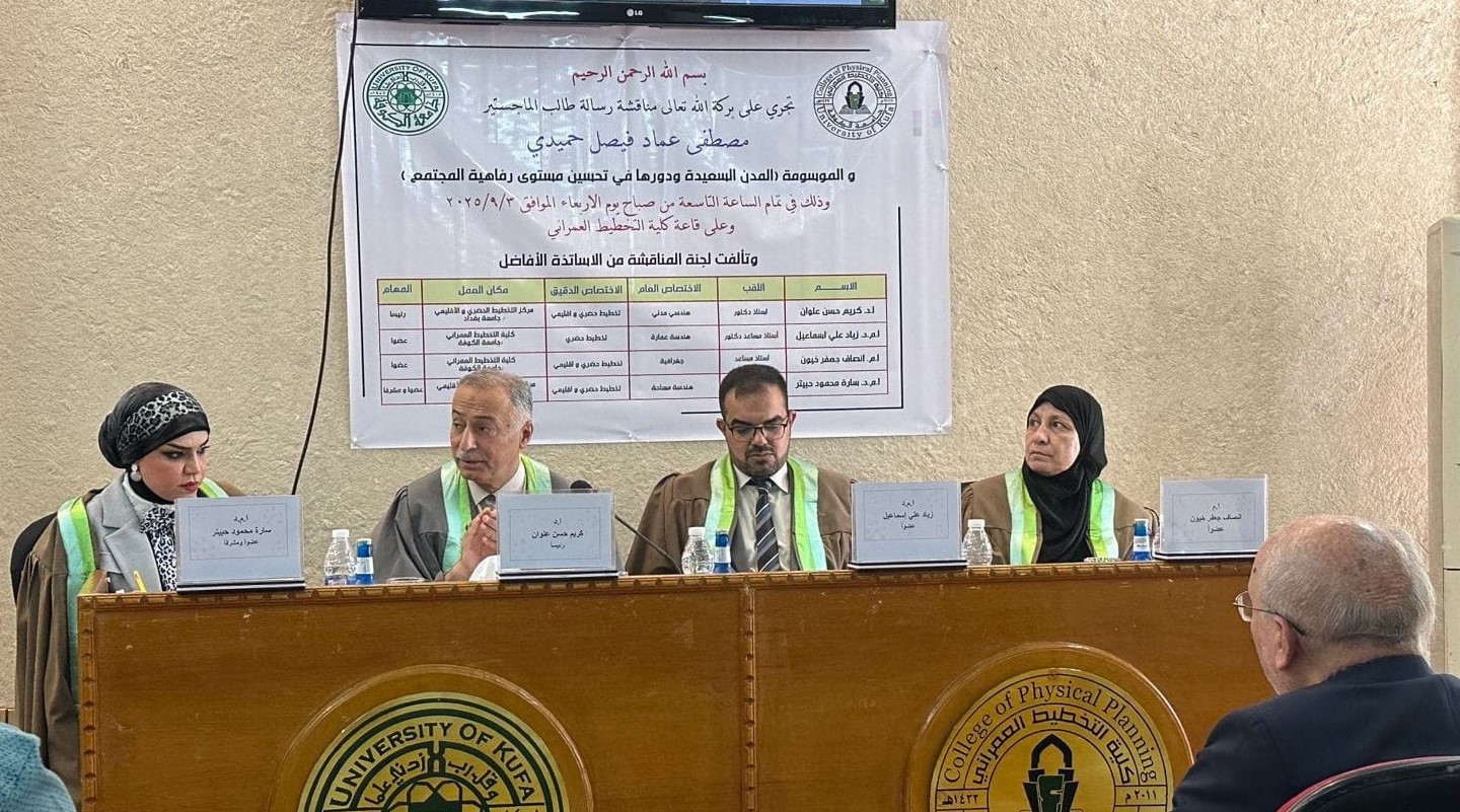 The Dean of the Center of Urban and Regional Planning for Postgraduate Studies at the University of Baghdad, Professor Dr. Kareem Hassan Alwan, chaired the Master’s thesis discussion committee at the College of Urban Planning at the University of Kufa. The thesis, titled “Happy Cities and Their Role in Improving Community Well-being,” was supervised by Assistant Professor Dr. Sara Mahmoud, a lecturer at the Center.